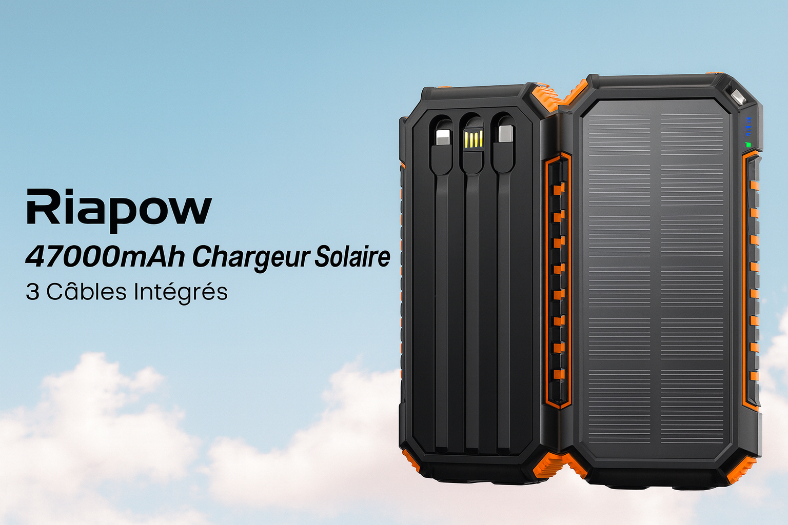 La batterie Riapow inclut 3 câbles intégrés (USB-C, Lightning, Micro-USB) pour recharger instantanément n’importe quel appareil : smartphone, tablette, écouteurs, caméra…